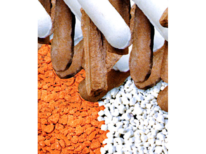 ◎ 該工藝為無(wú)干燥常溫造粒,針對(duì)粉狀物料(氯化鉀、氯化銨、硫酸鉀等)直接干法擠壓,可以加工直徑2~6mm范圍內(nèi)不規(guī)則顆粒,成品顆粒強(qiáng)度高、外觀新穎。